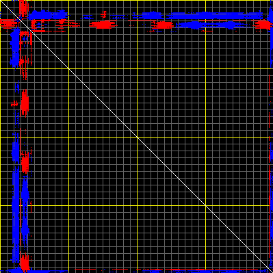 This matrix displays the maximum distance fluctuations between all pairs of CA atoms and between the two extreme conformations that were computed for this mode (DQMIN/DQMAX). Distance increases are plotted in blue and decreases in red for the strongest 10% of the residue pair distance changes. Every pixel corresponds to a single residue. Grey lines are drawn every 10 residues, yellow lines every 100 residues (counting from the upper left corner).