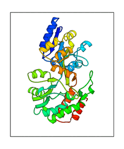 These views are prepared from three orthologuous viewpoints with MolScript. Secondary structures are determined from the C-alpha atom positions of your protein (N-terminal blue, C-terminal red).