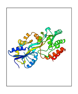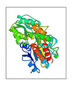 These views are prepared from three orthologuous viewpoints with MolScript. Secondary structures are determined from the C-alpha atom positions of your protein (N-terminal blue, C-terminal red).