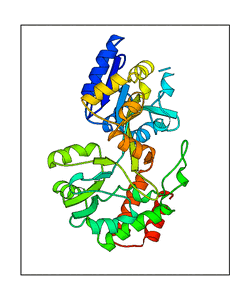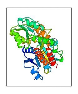 These views are prepared from three orthologuous viewpoints with MolScript. Secondary structures are determined from the C-alpha atom positions of your protein (N-terminal blue, C-terminal red).