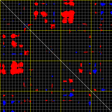 This matrix displays the maximum distance fluctuations between all pairs of CA atoms and between the two extreme conformations that were computed for this mode (DQMIN/DQMAX). Distance increases are plotted in blue and decreases in red for the strongest 10% of the residue pair distance changes. Every pixel corresponds to a single residue. Grey lines are drawn every 10 residues, yellow lines every 100 residues (counting from the upper left corner).