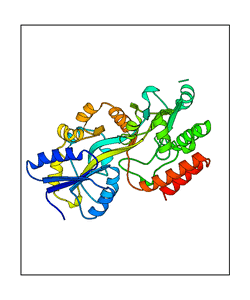 These views are prepared from three orthologuous viewpoints with MolScript. Secondary structures are determined from the C-alpha atom positions of your protein (N-terminal blue, C-terminal red).