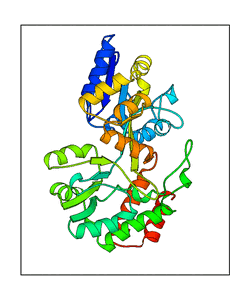 These views are prepared from three orthologuous viewpoints with MolScript. Secondary structures are determined from the C-alpha atom positions of your protein (N-terminal blue, C-terminal red).
