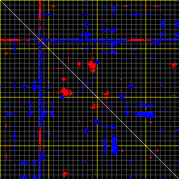 This matrix displays the maximum distance fluctuations between all pairs of CA atoms and between the two extreme conformations that were computed for this mode (DQMIN/DQMAX). Distance increases are plotted in blue and decreases in red for the strongest 10% of the residue pair distance changes. Every pixel corresponds to a single residue. Grey lines are drawn every 10 residues, yellow lines every 100 residues (counting from the upper left corner).