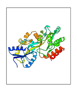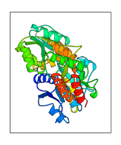 These views are prepared from three orthologuous viewpoints with MolScript. Secondary structures are determined from the C-alpha atom positions of your protein (N-terminal blue, C-terminal red).