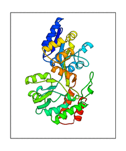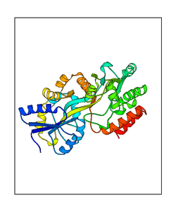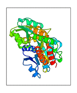 These views are prepared from three orthologuous viewpoints with MolScript. Secondary structures are determined from the C-alpha atom positions of your protein (N-terminal blue, C-terminal red).