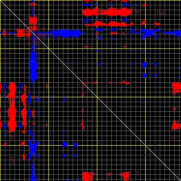 This matrix displays the maximum distance fluctuations between all pairs of CA atoms and between the two extreme conformations that were computed for this mode (DQMIN/DQMAX). Distance increases are plotted in blue and decreases in red for the strongest 10% of the residue pair distance changes. Every pixel corresponds to a single residue. Grey lines are drawn every 10 residues, yellow lines every 100 residues (counting from the upper left corner).