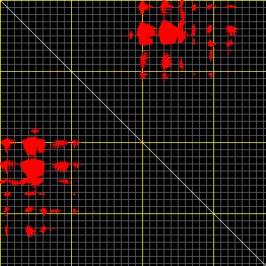 This matrix displays the maximum distance fluctuations between all pairs of CA atoms and between the two extreme conformations that were computed for this mode (DQMIN/DQMAX). Distance increases are plotted in blue and decreases in red for the strongest 10% of the residue pair distance changes. Every pixel corresponds to a single residue. Grey lines are drawn every 10 residues, yellow lines every 100 residues (counting from the upper left corner).