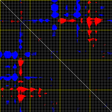 This matrix displays the maximum distance fluctuations between all pairs of CA atoms and between the two extreme conformations that were computed for this mode (DQMIN/DQMAX). Distance increases are plotted in blue and decreases in red for the strongest 10% of the residue pair distance changes. Every pixel corresponds to a single residue. Grey lines are drawn every 10 residues, yellow lines every 100 residues (counting from the upper left corner).