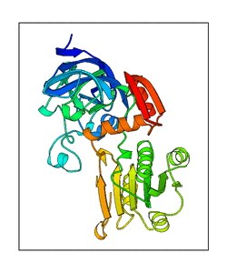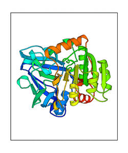 These views are prepared from three orthologuous viewpoints with MolScript. Secondary structures are determined from the C-alpha atom positions of your protein (N-terminal blue, C-terminal red).