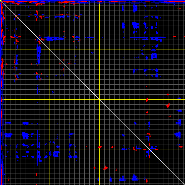This matrix displays the maximum distance fluctuations between all pairs of CA atoms and between the two extreme conformations that were computed for this mode (DQMIN/DQMAX). Distance increases are plotted in blue and decreases in red for the strongest 10% of the residue pair distance changes. Every pixel corresponds to a single residue. Grey lines are drawn every 10 residues, yellow lines every 100 residues (counting from the upper left corner).