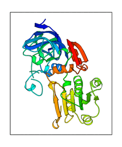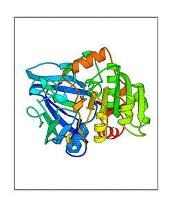 These views are prepared from three orthologuous viewpoints with MolScript. Secondary structures are determined from the C-alpha atom positions of your protein (N-terminal blue, C-terminal red).