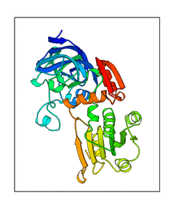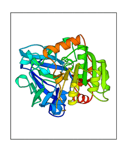 These views are prepared from three orthologuous viewpoints with MolScript. Secondary structures are determined from the C-alpha atom positions of your protein (N-terminal blue, C-terminal red).