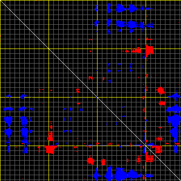 This matrix displays the maximum distance fluctuations between all pairs of CA atoms and between the two extreme conformations that were computed for this mode (DQMIN/DQMAX). Distance increases are plotted in blue and decreases in red for the strongest 10% of the residue pair distance changes. Every pixel corresponds to a single residue. Grey lines are drawn every 10 residues, yellow lines every 100 residues (counting from the upper left corner).