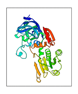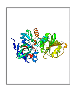 These views are prepared from three orthologuous viewpoints with MolScript. Secondary structures are determined from the C-alpha atom positions of your protein (N-terminal blue, C-terminal red).