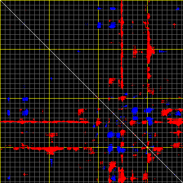 This matrix displays the maximum distance fluctuations between all pairs of CA atoms and between the two extreme conformations that were computed for this mode (DQMIN/DQMAX). Distance increases are plotted in blue and decreases in red for the strongest 10% of the residue pair distance changes. Every pixel corresponds to a single residue. Grey lines are drawn every 10 residues, yellow lines every 100 residues (counting from the upper left corner).