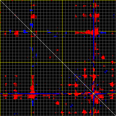 This matrix displays the maximum distance fluctuations between all pairs of CA atoms and between the two extreme conformations that were computed for this mode (DQMIN/DQMAX). Distance increases are plotted in blue and decreases in red for the strongest 10% of the residue pair distance changes. Every pixel corresponds to a single residue. Grey lines are drawn every 10 residues, yellow lines every 100 residues (counting from the upper left corner).