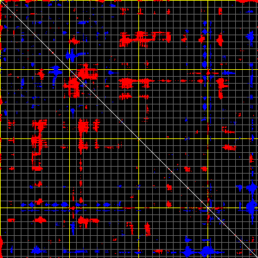 This matrix displays the maximum distance fluctuations between all pairs of CA atoms and between the two extreme conformations that were computed for this mode (DQMIN/DQMAX). Distance increases are plotted in blue and decreases in red for the strongest 10% of the residue pair distance changes. Every pixel corresponds to a single residue. Grey lines are drawn every 10 residues, yellow lines every 100 residues (counting from the upper left corner).