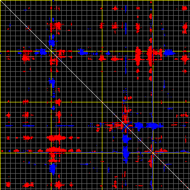 This matrix displays the maximum distance fluctuations between all pairs of CA atoms and between the two extreme conformations that were computed for this mode (DQMIN/DQMAX). Distance increases are plotted in blue and decreases in red for the strongest 10% of the residue pair distance changes. Every pixel corresponds to a single residue. Grey lines are drawn every 10 residues, yellow lines every 100 residues (counting from the upper left corner).