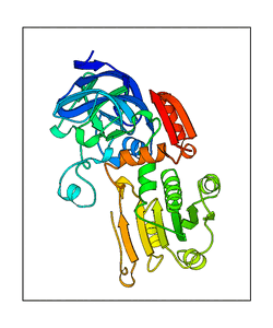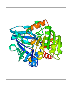 These views are prepared from three orthologuous viewpoints with MolScript. Secondary structures are determined from the C-alpha atom positions of your protein (N-terminal blue, C-terminal red).