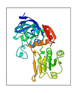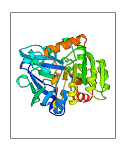 These views are prepared from three orthologuous viewpoints with MolScript. Secondary structures are determined from the C-alpha atom positions of your protein (N-terminal blue, C-terminal red).