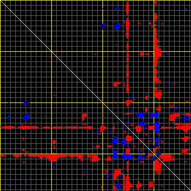 This matrix displays the maximum distance fluctuations between all pairs of CA atoms and between the two extreme conformations that were computed for this mode (DQMIN/DQMAX). Distance increases are plotted in blue and decreases in red for the strongest 10% of the residue pair distance changes. Every pixel corresponds to a single residue. Grey lines are drawn every 10 residues, yellow lines every 100 residues (counting from the upper left corner).