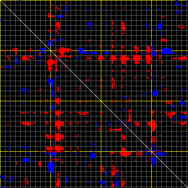 This matrix displays the maximum distance fluctuations between all pairs of CA atoms and between the two extreme conformations that were computed for this mode (DQMIN/DQMAX). Distance increases are plotted in blue and decreases in red for the strongest 10% of the residue pair distance changes. Every pixel corresponds to a single residue. Grey lines are drawn every 10 residues, yellow lines every 100 residues (counting from the upper left corner).