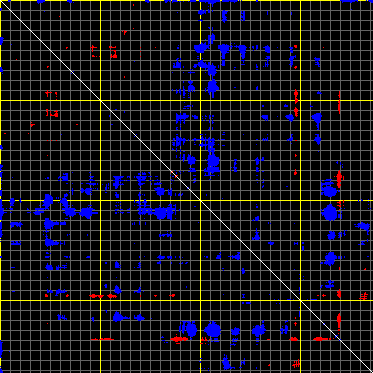 This matrix displays the maximum distance fluctuations between all pairs of CA atoms and between the two extreme conformations that were computed for this mode (DQMIN/DQMAX). Distance increases are plotted in blue and decreases in red for the strongest 10% of the residue pair distance changes. Every pixel corresponds to a single residue. Grey lines are drawn every 10 residues, yellow lines every 100 residues (counting from the upper left corner).