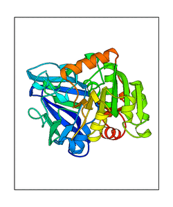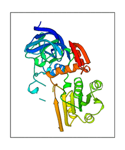 These views are prepared from three orthologuous viewpoints with MolScript. Secondary structures are determined from the C-alpha atom positions of your protein (N-terminal blue, C-terminal red).