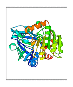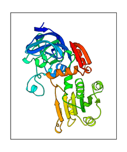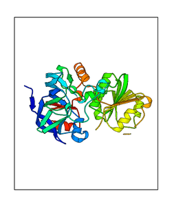 These views are prepared from three orthologuous viewpoints with MolScript. Secondary structures are determined from the C-alpha atom positions of your protein (N-terminal blue, C-terminal red).