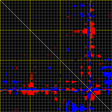 This matrix displays the maximum distance fluctuations between all pairs of CA atoms and between the two extreme conformations that were computed for this mode (DQMIN/DQMAX). Distance increases are plotted in blue and decreases in red for the strongest 10% of the residue pair distance changes. Every pixel corresponds to a single residue. Grey lines are drawn every 10 residues, yellow lines every 100 residues (counting from the upper left corner).