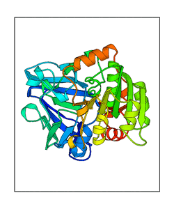 These views are prepared from three orthologuous viewpoints with MolScript. Secondary structures are determined from the C-alpha atom positions of your protein (N-terminal blue, C-terminal red).