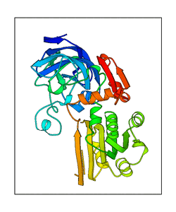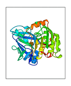 These views are prepared from three orthologuous viewpoints with MolScript. Secondary structures are determined from the C-alpha atom positions of your protein (N-terminal blue, C-terminal red).