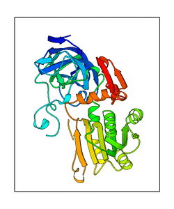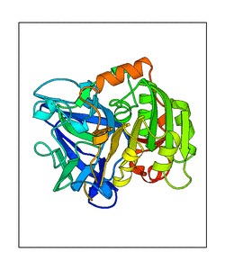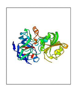 These views are prepared from three orthologuous viewpoints with MolScript. Secondary structures are determined from the C-alpha atom positions of your protein (N-terminal blue, C-terminal red).