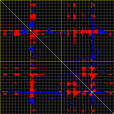 This matrix displays the maximum distance fluctuations between all pairs of CA atoms and between the two extreme conformations that were computed for this mode (DQMIN/DQMAX). Distance increases are plotted in blue and decreases in red for the strongest 10% of the residue pair distance changes. Every pixel corresponds to a single residue. Grey lines are drawn every 10 residues, yellow lines every 100 residues (counting from the upper left corner).