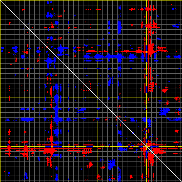 This matrix displays the maximum distance fluctuations between all pairs of CA atoms and between the two extreme conformations that were computed for this mode (DQMIN/DQMAX). Distance increases are plotted in blue and decreases in red for the strongest 10% of the residue pair distance changes. Every pixel corresponds to a single residue. Grey lines are drawn every 10 residues, yellow lines every 100 residues (counting from the upper left corner).