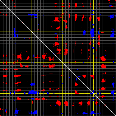 This matrix displays the maximum distance fluctuations between all pairs of CA atoms and between the two extreme conformations that were computed for this mode (DQMIN/DQMAX). Distance increases are plotted in blue and decreases in red for the strongest 10% of the residue pair distance changes. Every pixel corresponds to a single residue. Grey lines are drawn every 10 residues, yellow lines every 100 residues (counting from the upper left corner).