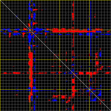 This matrix displays the maximum distance fluctuations between all pairs of CA atoms and between the two extreme conformations that were computed for this mode (DQMIN/DQMAX). Distance increases are plotted in blue and decreases in red for the strongest 10% of the residue pair distance changes. Every pixel corresponds to a single residue. Grey lines are drawn every 10 residues, yellow lines every 100 residues (counting from the upper left corner).