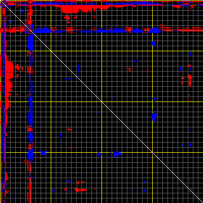 This matrix displays the maximum distance fluctuations between all pairs of CA atoms and between the two extreme conformations that were computed for this mode (DQMIN/DQMAX). Distance increases are plotted in blue and decreases in red for the strongest 10% of the residue pair distance changes. Every pixel corresponds to a single residue. Grey lines are drawn every 10 residues, yellow lines every 100 residues (counting from the upper left corner).