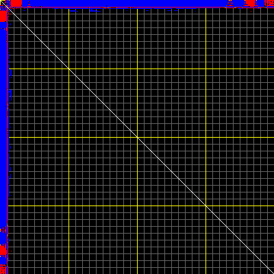 This matrix displays the maximum distance fluctuations between all pairs of CA atoms and between the two extreme conformations that were computed for this mode (DQMIN/DQMAX). Distance increases are plotted in blue and decreases in red for the strongest 10% of the residue pair distance changes. Every pixel corresponds to a single residue. Grey lines are drawn every 10 residues, yellow lines every 100 residues (counting from the upper left corner).