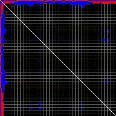 This matrix displays the maximum distance fluctuations between all pairs of CA atoms and between the two extreme conformations that were computed for this mode (DQMIN/DQMAX). Distance increases are plotted in blue and decreases in red for the strongest 10% of the residue pair distance changes. Every pixel corresponds to a single residue. Grey lines are drawn every 10 residues, yellow lines every 100 residues (counting from the upper left corner).