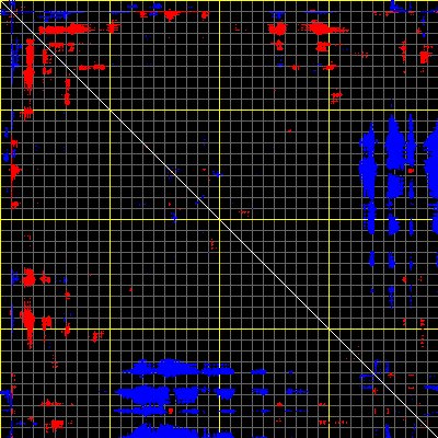 This matrix displays the maximum distance fluctuations between all pairs of CA atoms and between the two extreme conformations that were computed for this mode (DQMIN/DQMAX). Distance increases are plotted in blue and decreases in red for the strongest 10% of the residue pair distance changes. Every pixel corresponds to a single residue. Grey lines are drawn every 10 residues, yellow lines every 100 residues (counting from the upper left corner).