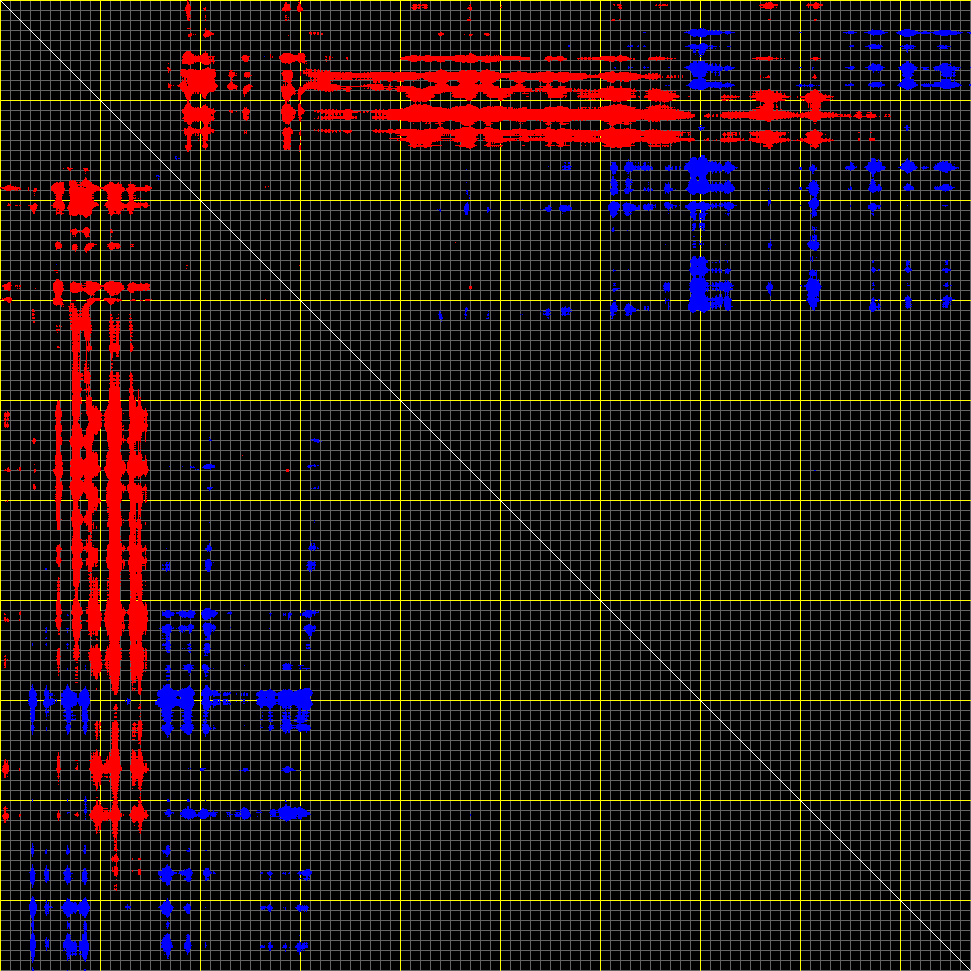 This matrix displays the maximum distance fluctuations between all pairs of CA atoms and between the two extreme conformations that were computed for this mode (DQMIN/DQMAX). Distance increases are plotted in blue and decreases in red for the strongest 10% of the residue pair distance changes. Every pixel corresponds to a single residue. Grey lines are drawn every 10 residues, yellow lines every 100 residues (counting from the upper left corner).
