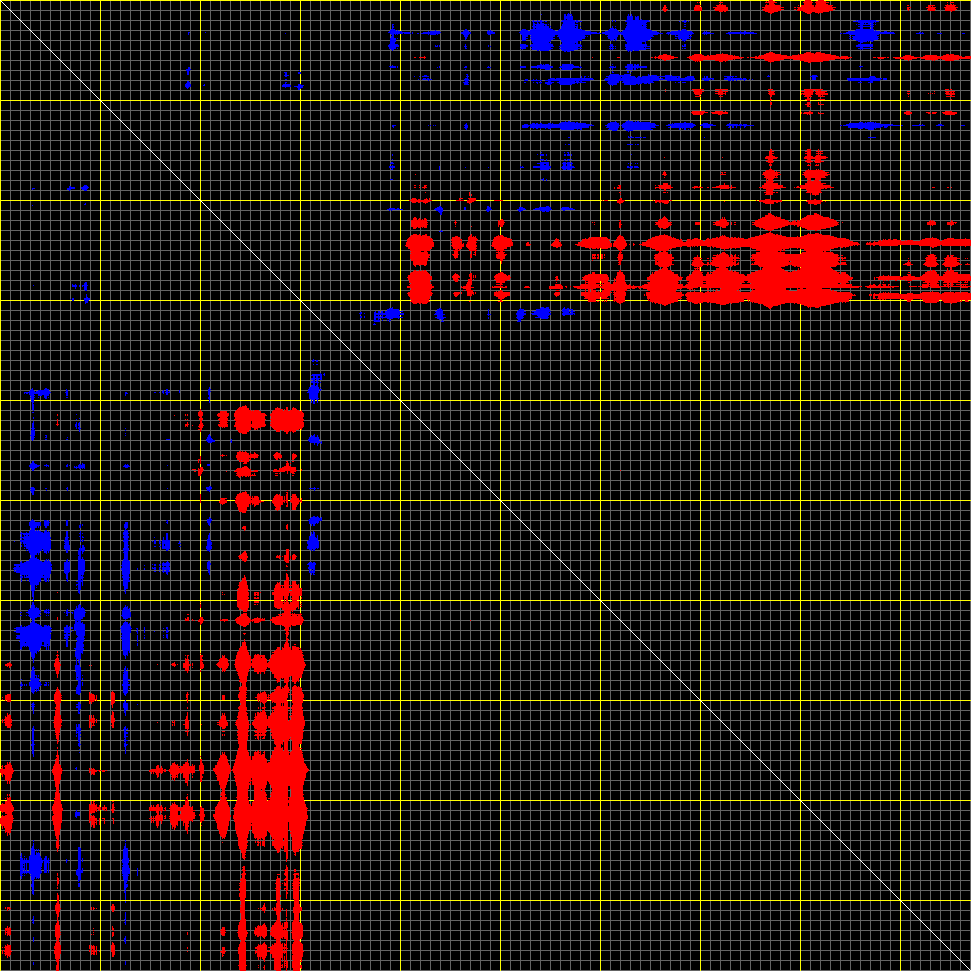 This matrix displays the maximum distance fluctuations between all pairs of CA atoms and between the two extreme conformations that were computed for this mode (DQMIN/DQMAX). Distance increases are plotted in blue and decreases in red for the strongest 10% of the residue pair distance changes. Every pixel corresponds to a single residue. Grey lines are drawn every 10 residues, yellow lines every 100 residues (counting from the upper left corner).