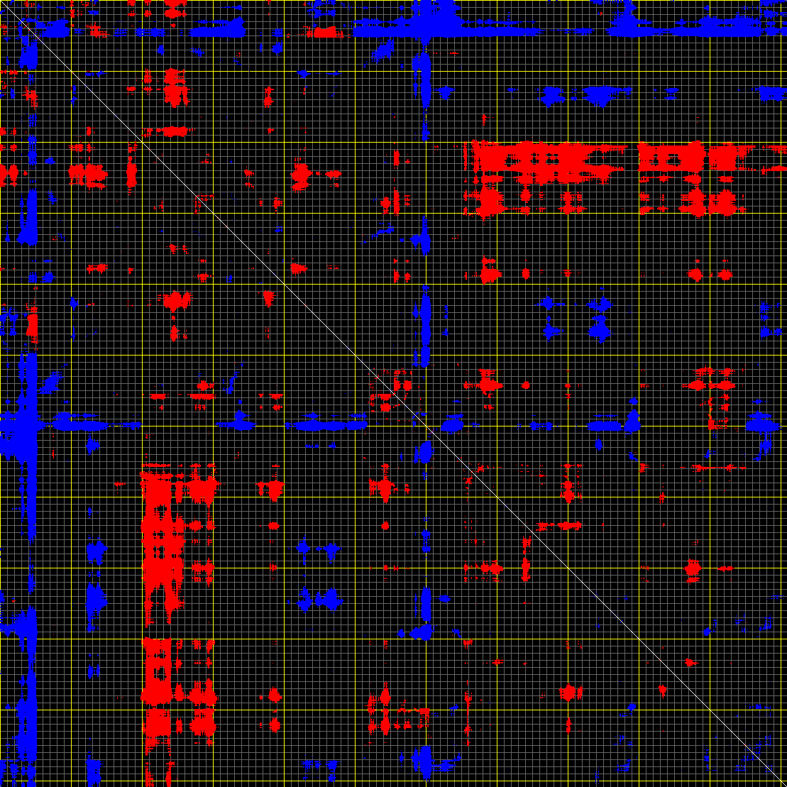 This matrix displays the maximum distance fluctuations between all pairs of CA atoms and between the two extreme conformations that were computed for this mode (DQMIN/DQMAX). Distance increases are plotted in blue and decreases in red for the strongest 10% of the residue pair distance changes. Every pixel corresponds to a single residue. Grey lines are drawn every 10 residues, yellow lines every 100 residues (counting from the upper left corner).