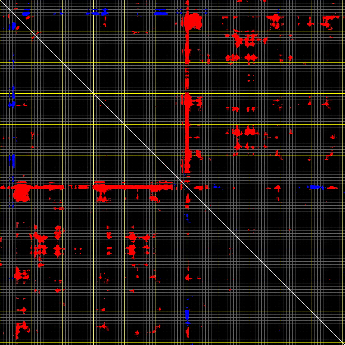 This matrix displays the maximum distance fluctuations between all pairs of CA atoms and between the two extreme conformations that were computed for this mode (DQMIN/DQMAX). Distance increases are plotted in blue and decreases in red for the strongest 10% of the residue pair distance changes. Every pixel corresponds to a single residue. Grey lines are drawn every 10 residues, yellow lines every 100 residues (counting from the upper left corner).