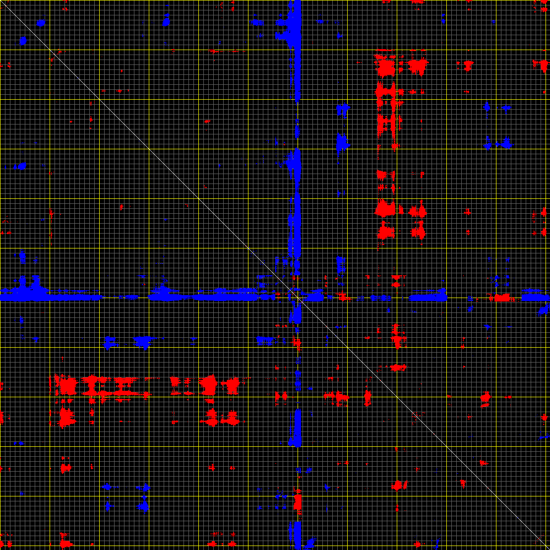 This matrix displays the maximum distance fluctuations between all pairs of CA atoms and between the two extreme conformations that were computed for this mode (DQMIN/DQMAX). Distance increases are plotted in blue and decreases in red for the strongest 10% of the residue pair distance changes. Every pixel corresponds to a single residue. Grey lines are drawn every 10 residues, yellow lines every 100 residues (counting from the upper left corner).