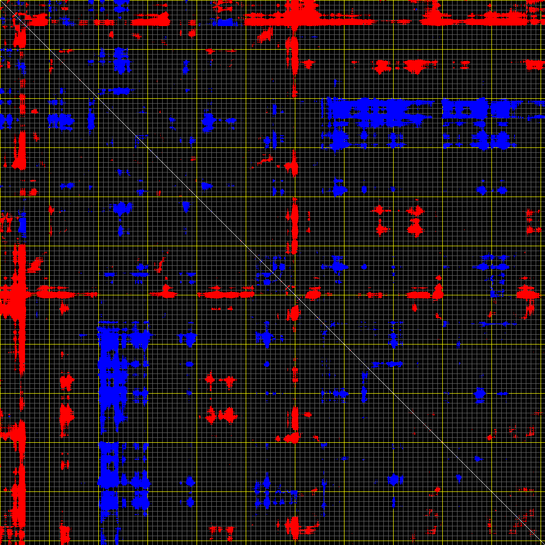 This matrix displays the maximum distance fluctuations between all pairs of CA atoms and between the two extreme conformations that were computed for this mode (DQMIN/DQMAX). Distance increases are plotted in blue and decreases in red for the strongest 10% of the residue pair distance changes. Every pixel corresponds to a single residue. Grey lines are drawn every 10 residues, yellow lines every 100 residues (counting from the upper left corner).