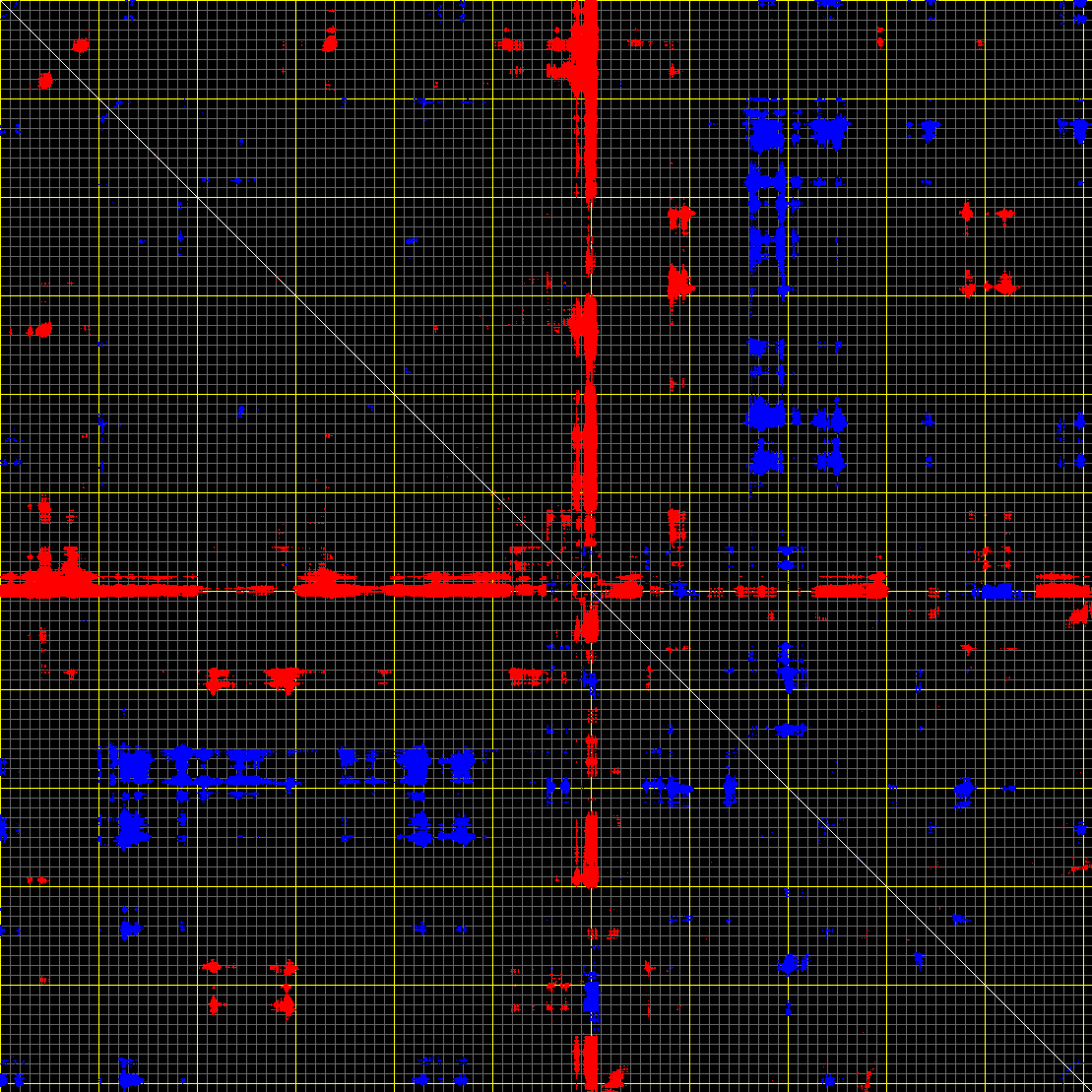 This matrix displays the maximum distance fluctuations between all pairs of CA atoms and between the two extreme conformations that were computed for this mode (DQMIN/DQMAX). Distance increases are plotted in blue and decreases in red for the strongest 10% of the residue pair distance changes. Every pixel corresponds to a single residue. Grey lines are drawn every 10 residues, yellow lines every 100 residues (counting from the upper left corner).