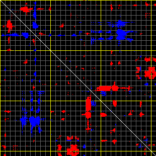 This matrix displays the maximum distance fluctuations between all pairs of CA atoms and between the two extreme conformations that were computed for this mode (DQMIN/DQMAX). Distance increases are plotted in blue and decreases in red for the strongest 10% of the residue pair distance changes. Every pixel corresponds to a single residue. Grey lines are drawn every 10 residues, yellow lines every 100 residues (counting from the upper left corner).